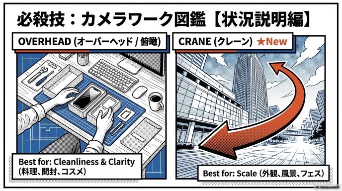 • 使いどころ: 料理の手元、ガジェットの開封、コスメの色味紹介。清潔感や全体像を伝えたい時に最強です。