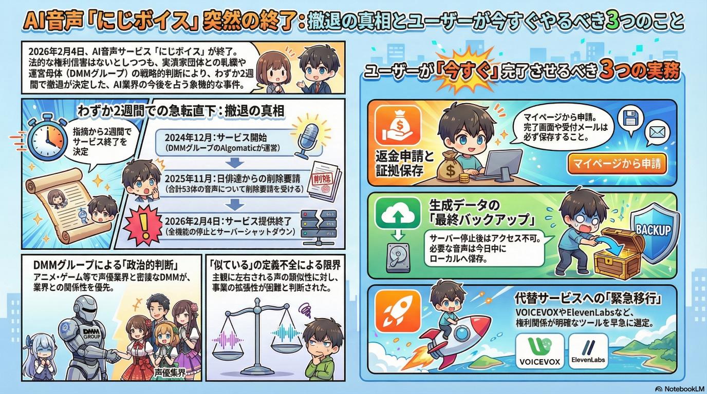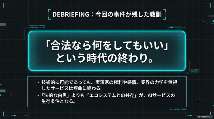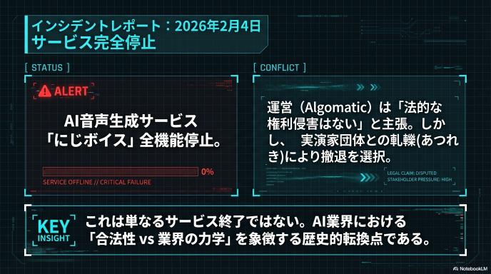 「にじボイス」の終了は、AIビジネスにおける「合法なら何をしてもいいわけではない」という現実を突きつけました。