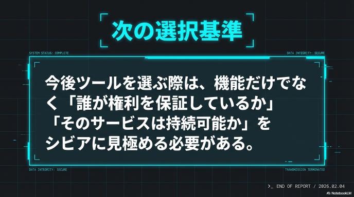 技術的には可能であっても、実演家の権利や感情、そして業界の力学を無視したサービスは、短命に終わるリスクを常にはらんでいます。私たち利用者も、今後は「どのデータで学習され、誰が権利を保証しているのか」をシビアに見て、ツールを選ぶ必要があるでしょう。