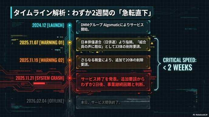 | 2025年11月21日 | サービス終了を発表 | 追加要請の2日後、事業継続は困難と判断。 |