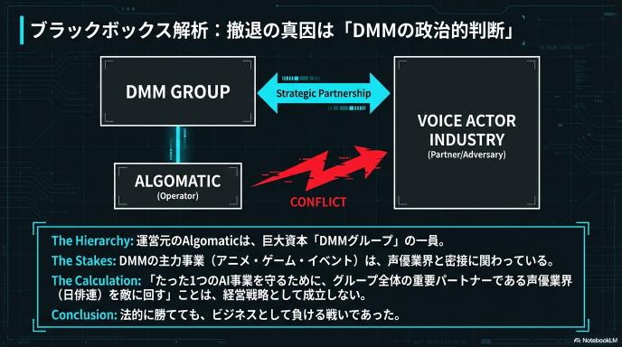「AI事業を1つ守るために、グループ全体の重要パートナーである声優業界(日俳連)を敵に回す」ことは、経営戦略として明らかに「割に合わない」選択でした。