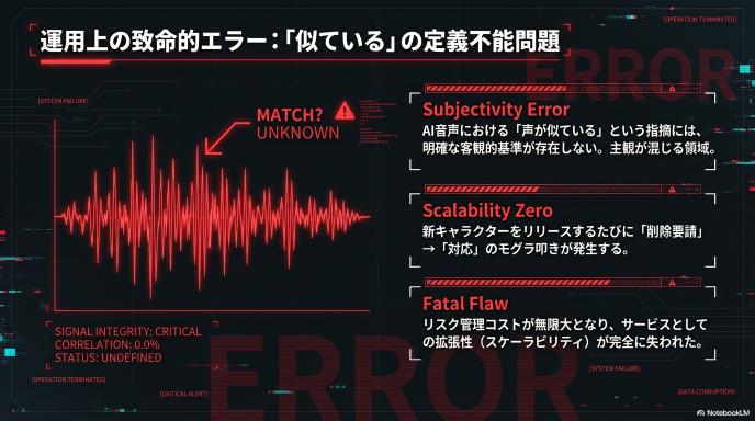 今後も新キャラクターを出すたびに同様の指摘・削除対応が発生するリスクを抱えたままでは、サービスとしてのスケーラビリティ(拡張性)がゼロであると判断されたのが実情でしょう。