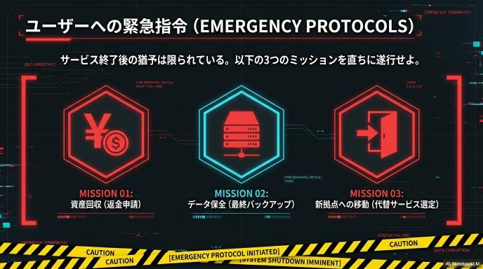 サービスが終了した現在、ユーザーに残された時間は限られています。以下の3点を最優先で確認してください。