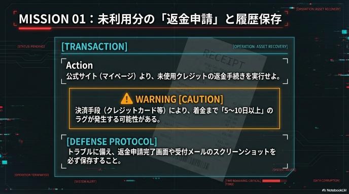 - 対策: 念のため、返金申請完了の画面や受付メールをスクリーンショット等で保存しておきましょう。