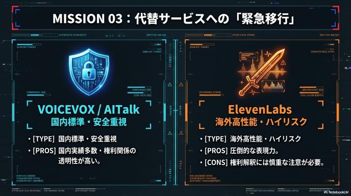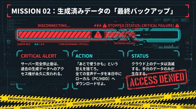 - 対策: 「あとで使うかも」と思っていた生成音声は、今日中にローカル(PCやクラウドストレージ)へダウンロードしてください。