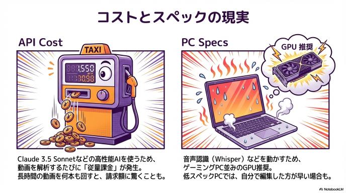 - コスト: 高性能なAI(Claude 3.5 Sonnetなど)を使うため、動画を解析するたびに「API利用料」がかかります。長時間の動画を何本も解析すると、お財布に優しくない場合があります。