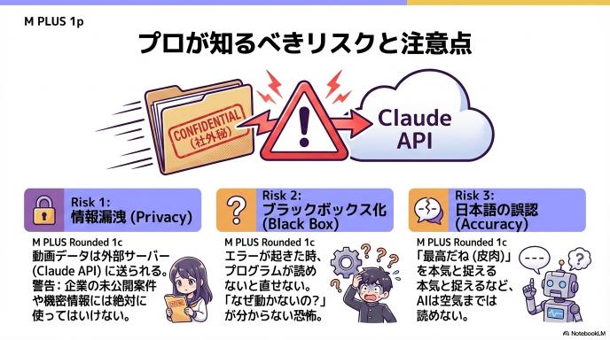 最大のリスクは「情報漏洩」です。 この仕組みは、あなたのPCにある動画データを、インターネットを通じてClaude(Anthropic社のサーバー)に送信し、そこで解析を行います。