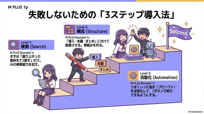 いきなり「全自動化」を目指すと失敗します。まずは小さな作業からAIに任せてみましょう。おすすめの3ステップです。