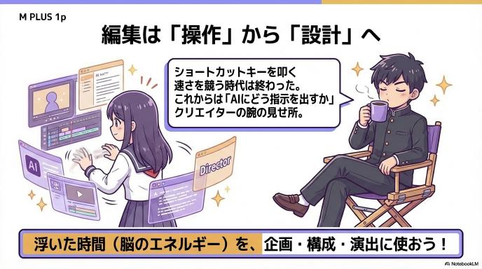 これまでの動画編集は、ショートカットキーを覚え、マウス操作を極める「職人芸」の世界でした。しかし、MCPを使えば、その修行期間をスキップできます。 浮いた時間はどこへ行くのか? それは「どんな動画を作るか」という企画や構成(ディレクション)に使われます。