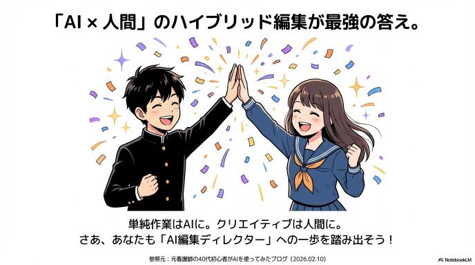 「全部手動」は時間がかかりすぎますし、「全部AI任せ」ではクオリティに限界があります。 「単純作業(荒編集)はAI、クリエイティブ(演出)は人間」。 この使い分けができる人こそが、AI時代の動画編集で生き残っていく「賢い編集者」だと言えるでしょう。