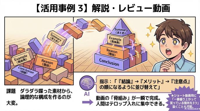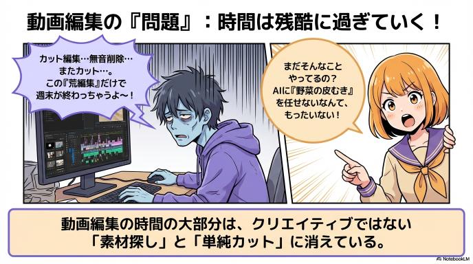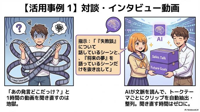 - After(これから): 素材を読み込ませたら、AIに「検索」をかけます。「一番盛り上がっている会話」「結論部分」をAIに見つけさせ、「配置」ボタン(に相当する指示)を押すだけ。 料理で言えば、「野菜を洗って皮を剥き、一口サイズに切る」ところまでを全自動化するイメージです。