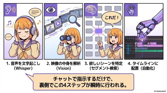 - ✅ できること: 「3時間の撮影データから、社長が『売上』について話している15秒だけを探し出し、タイムラインの先頭に置く」