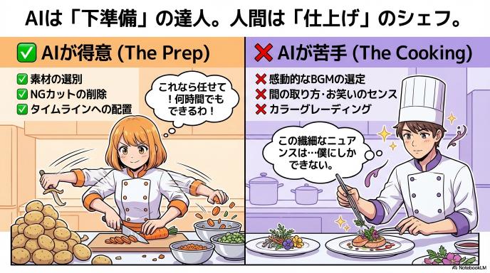 勘違いしてはいけないのは、AIが「面白い動画」を作ってくれるわけではないということです。 AIがやってくれるのは、あくまで「面倒な下準備(素材探し・カット)」まで。料理で言えば「野菜の皮をむいて切る」ところまでです。 どう味付けして、どう盛り付けるか(演出・テロップ・BGM)は、まだ人間の仕事として残されています。
