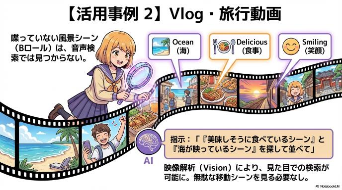 そこで活躍するのが「映像解析(Vision)」です。 「『料理を食べているシーン』と『海が映っているシーン』だけを探して並べて」 こう指示すれば、AIが映像の中身を見て判断してくれます。「移動中の地面を撮っていただけの無駄なシーン」を見る必要はもうありません。