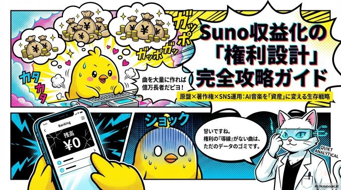この記事では、Sunoで作った楽曲をビジネスとして成立させるための「原盤×著作権」の二本柱の立て方から、YouTube・TikTokで“生き残る”ための実務設計、そして最初の90日で回すべき最小実行プランまで、現場仕様のノウハウを徹底解説します。