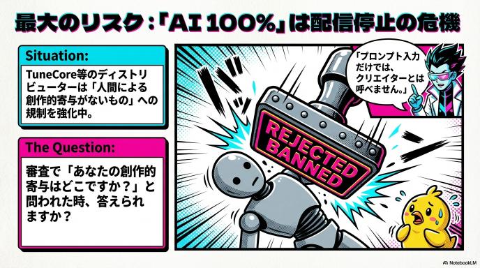 そのまま配信申請を出すと、審査で「AI生成物ですか?」「あなたの創作的寄与はどこですか?」と問われたり、最悪の場合は配信停止になるリスクがあります。