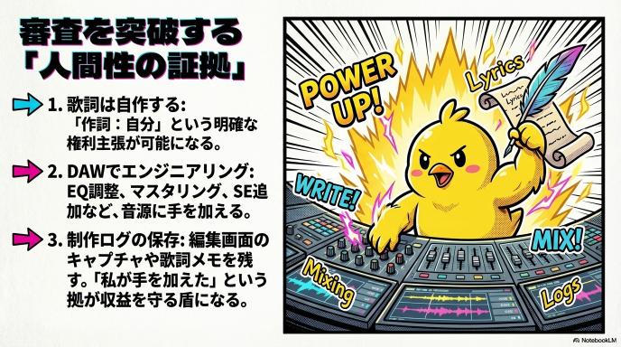 - 歌詞は自作する(または大幅にリライトする):AI任せにせず、自分で歌詞を書くことで「作詞:自分」という明確な権利主張ができます。