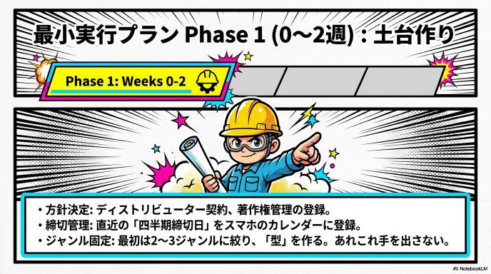 - [ ] 24時間以内: 著作権管理・ディストリビューターの方針を決め、直近の「締切日」をスマホのカレンダーに入れる。
