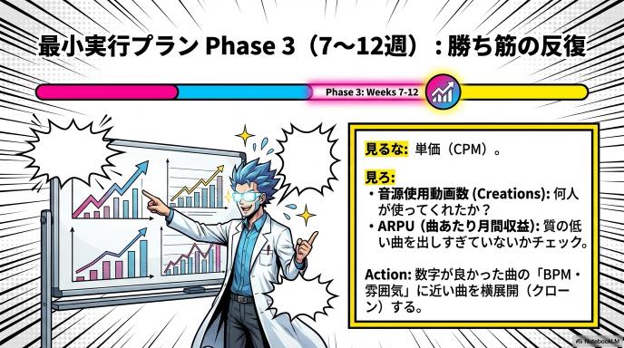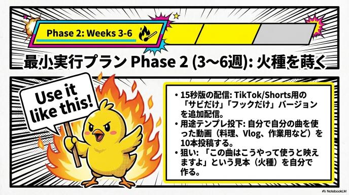 - [ ] 30日以内: 自分の曲を使った「用途テンプレ動画」をSNSに投稿し、最初のUGC(火種)を作る。