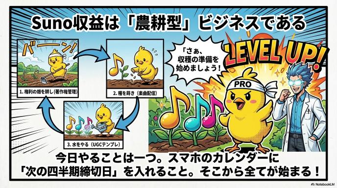 Suno収益は「一発当てる」ものではなく、「権利の畑を耕して、種(曲)を蒔き、水(UGC)をやって育てる」農耕型のビジネスです。正しい設計さえできれば、AI音楽はあなたの強力な資産になります。まずは土台の設計から始めましょう。