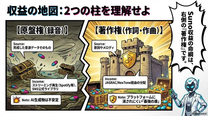 収益には「原盤(録音)」と「著作権(作詞・作曲)」の2つの流れがあります。AI音楽においては、不安定な原盤収益よりも、確実性の高い著作権収益をどう積み上げるかがカギになります。
