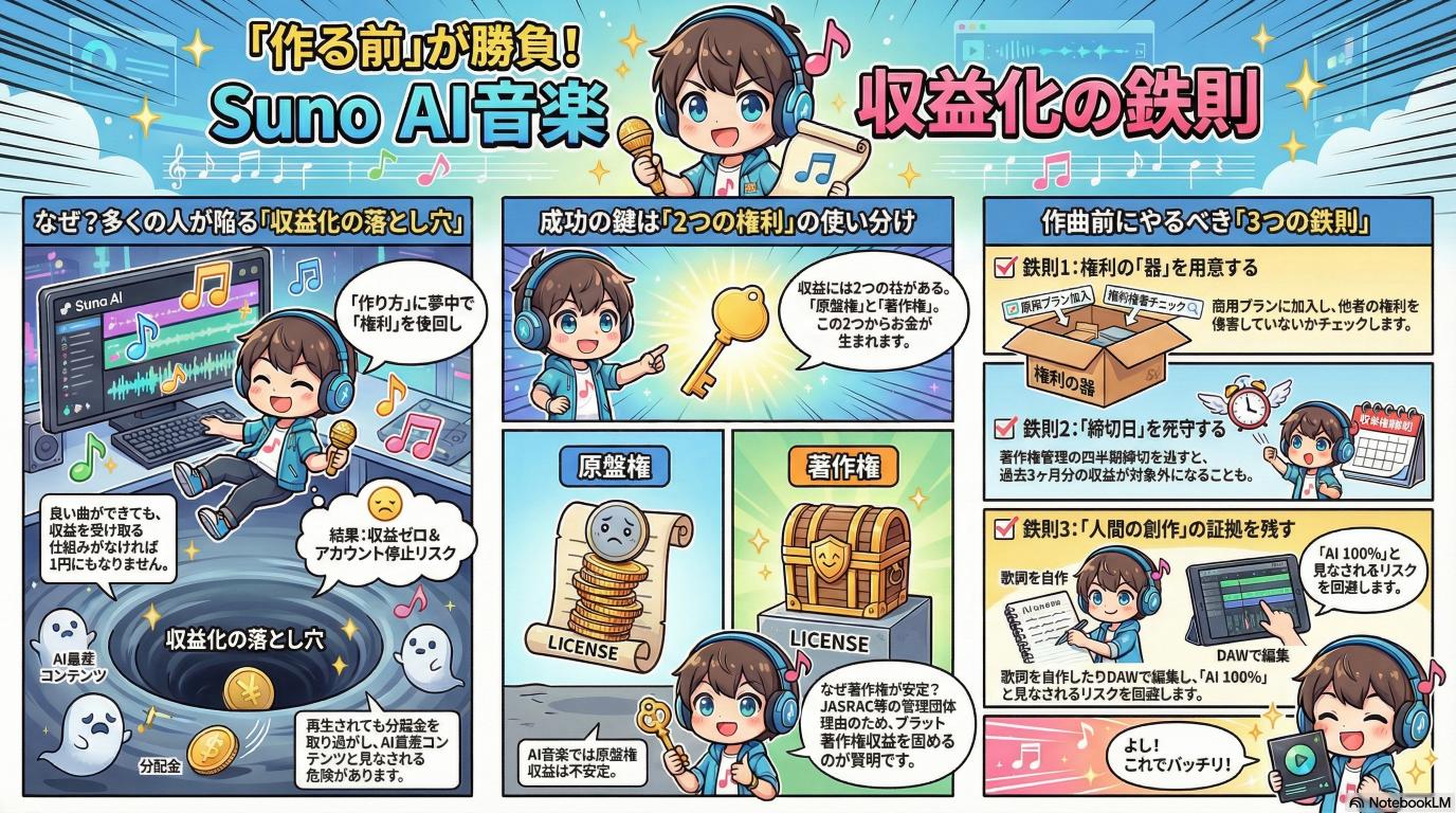 「Sunoで稼ぐ」というと、どうしても「プロンプトのコツ」や「曲を大量生産する方法」に目が向きがちです。しかし、実務の現場で収益を上げているクリエイターが最初に固めているのは、制作手法ではなく「権利と導線」の設計です。