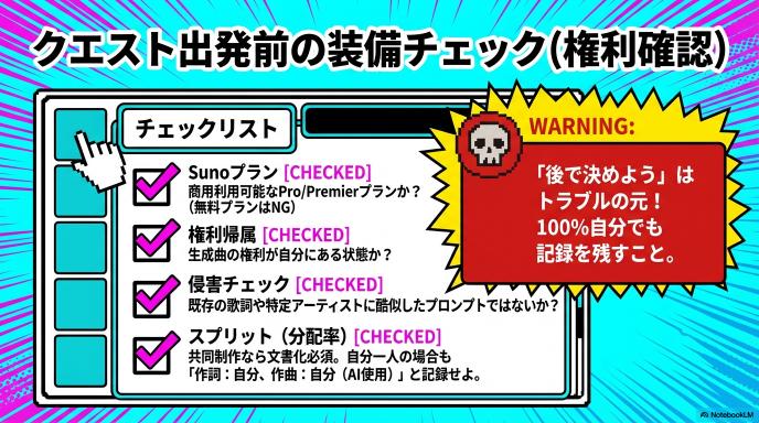 AI音楽であっても、少しでも人間の手が加われば「誰が何%の権利を持つか」という話になります。「後で決めよう」はトラブルの元です。100%自分一人の場合でも、「作詞:自分、作曲:自分(またはAIツール使用)」といった記録を残す癖をつけてください。