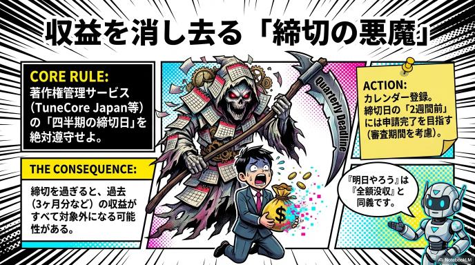 - 締切日(例:各四半期の10日など): この日までに楽曲の届出申請が完了していないと、その期間(過去3ヶ月分など)に発生した収益が対象外になる可能性があります。