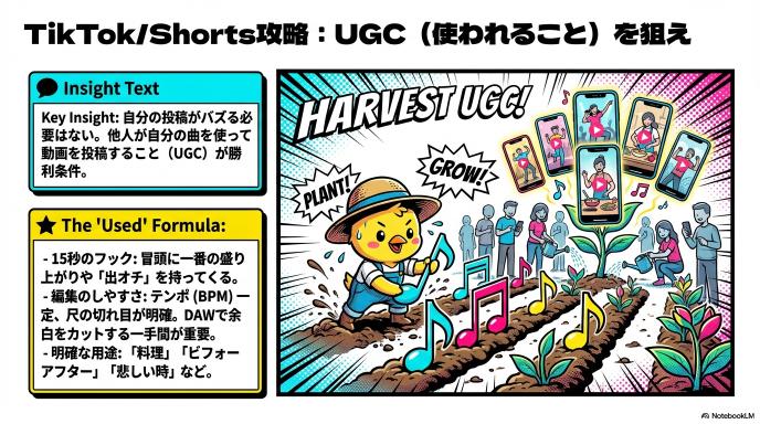 狙うべきは、自分の投稿がバズることではなく、「他の人が自分の曲を使って動画を投稿してくれること(UGC)」です。使われる曲には共通点があります。