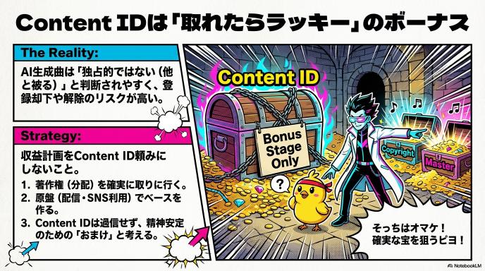 - AI生成の特性: Sunoなどの生成AIは、似たようなフレーズやビートを生成する可能性があります。これが「独占的ではない(他と被る)」と判断されると、Content IDの登録が却下されたり、後から登録解除(剥がれる)されたりします。