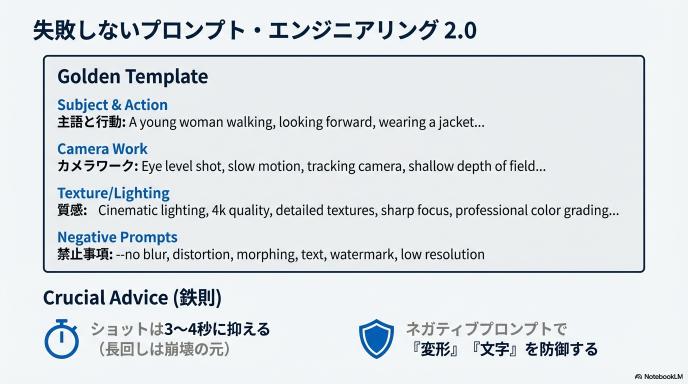 - 禁止事項(ネガティブプロンプト)を入れる:「変形しないで」「文字を出さないで」といった禁止ルールを事前にセットしておく(具体的なテンプレートは次の章で紹介します)。