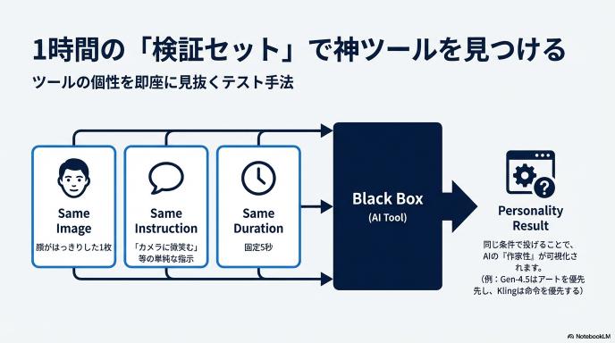 これを全ツールに投げると、驚くほど差が出ます。「Aは顔が崩れたけど、Bは完璧に維持した」「Cは動きが滑らかだけど、Dはカクカクした」といった特徴が一発で可視化されます。