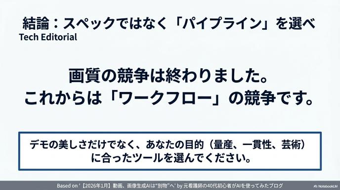 これまでは「AIが作った面白い映像」を楽しむ「生成(Generation)」の時代でした。 しかし今は、自分のイメージ通りの映像をコントロールして作る「制作(Production)」の時代です。