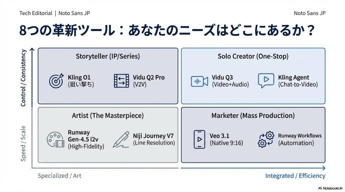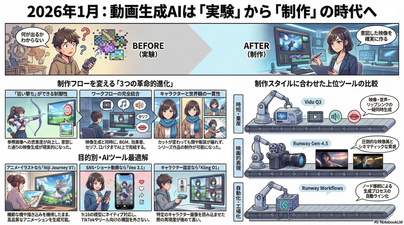 2026年1月は、動画生成AIにとって明確な転換点となりました。これまでの「何が出るかわからない」生成実験のフェーズから、狙った映像を確実に作る「制作」のフェーズへと移行したからです。