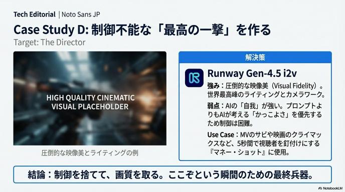 ⑤ Runway Gen-4.5 i2v:シネマ感は強い、ただし言うことも聞かない